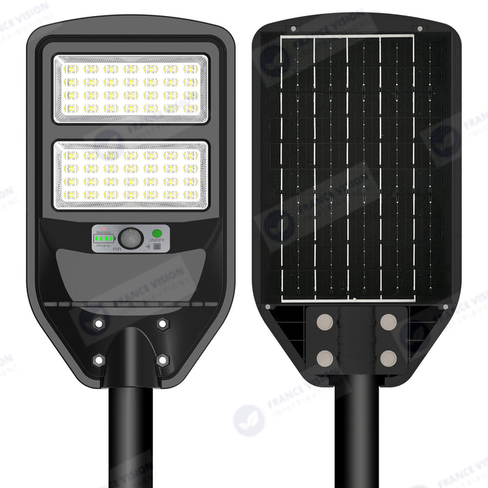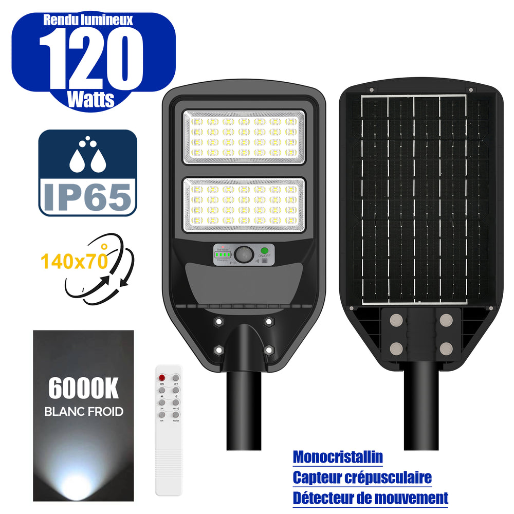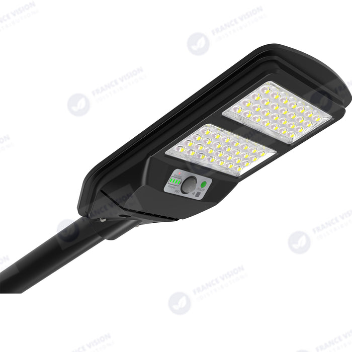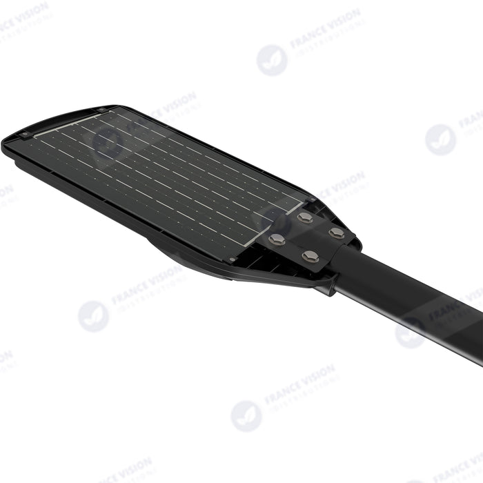Solaire - Luminaire LED pour Candélabre / Lampe de rue et parking - Série VIEW V2 - 120 Watts - 1200 Lumens - Angle 140*70° - IP65 - Lampe 41 x 23 x 5 cm - Panneau MONOCRISTALLIN - 30 x 21 cm - Détecteur de mouvement - 6000k - Tube d'insertion 45mm