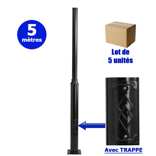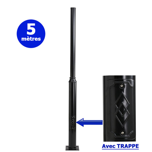 Mât / Poteau pour lampe de rue - Série STANDARD V2 EVO avec TRAPPE - Vis antivol - 5 mètres - Entraxe latéral des trous 200mm - Couleur Noir