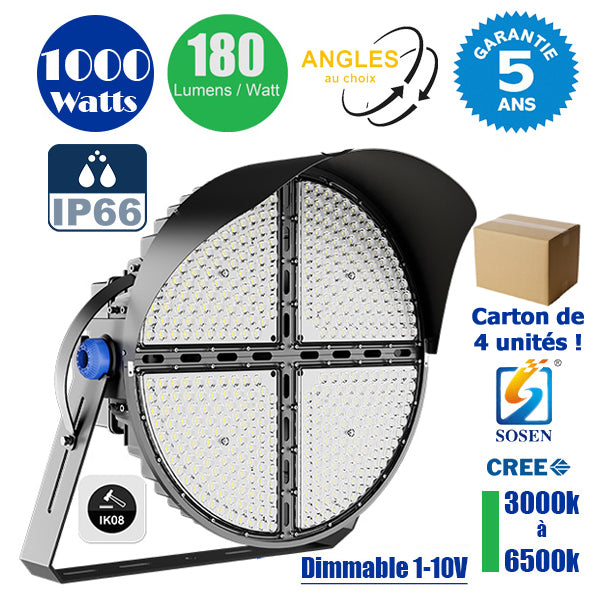 Carton / Lot de 4x Projecteurs de stade - Série ROUND V2 - 1000 Watts - 180 000 Lumens - 180 Lumens/Watt - Angle 20° / 30° / 45° / 60° au choix - IP66 - 70 x 65 x 26 cm - 3000k à 6500k - Dimmable - Transformateur SOSEN - Garantie 5 ans