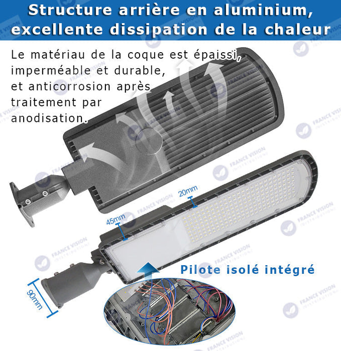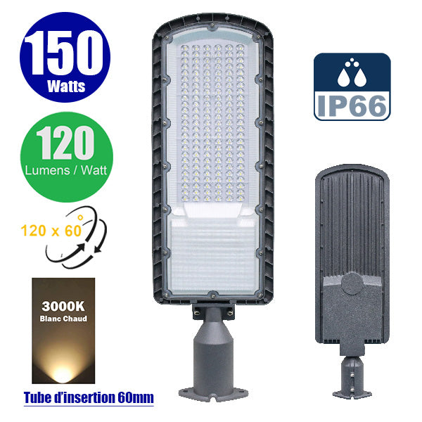 Lampe de rue filaire - Série FLEX ECO - 150 Watts - 18 000 Lumens - 120 Lumens/Watt - Angle 120 x 60° - IP66 - IK08 - 665 x 210 x 80mm - Tube d'insertion 60mm - 3000k