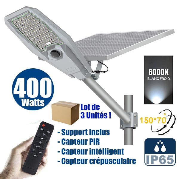 Lot de 3x Lampes de rue solaire - Série INTERSTELLAR ULTRA - 400 Watts - 3100 Lumens - Angle 150x70° - IP65 - Lampe 62 x 30 x 8 cm - Controleur intelligent - Avec télecommande - Capteur PIR - 6000k - Support inclus - Capteur crépusculaire