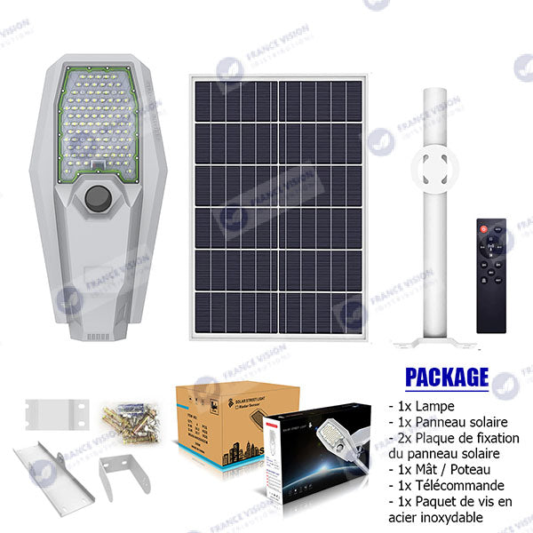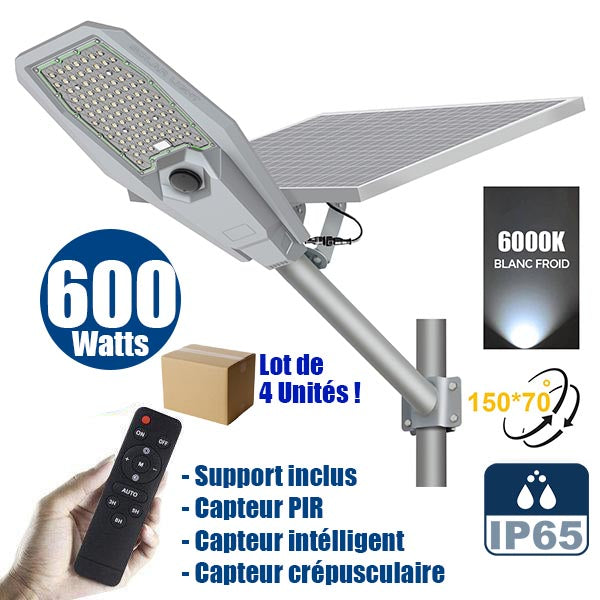 Lot de 4x Lampes de rue solaire - Série INTERSTELLAR ULTRA - 600 Watts - 3600 Lumens - Angle 150x70° - IP65 - Lampe 62 x 30 x 8 cm - Controleur intelligent - Avec télecommande - Capteur PIR - 6000k - Support inclus - Capteur crépusculaire