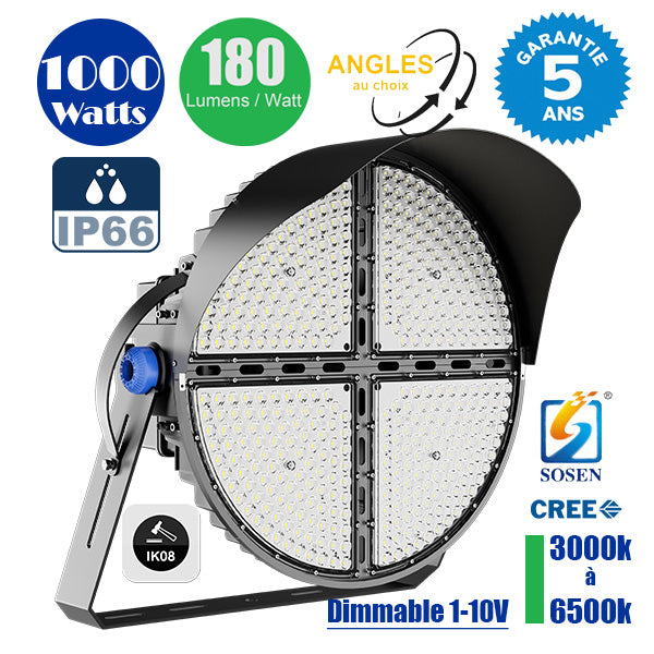 Projecteur de stade - Série ROUND V2 - 1000 Watts - 180 000 Lumens - 180 Lumens/Watt - Angle 20° / 30° / 45° / 60° au choix - IP66 - 70 x 65 x 26 cm - 3000k à 6500k - Dimmable - Transformateur SOSEN - Garantie 5 ans