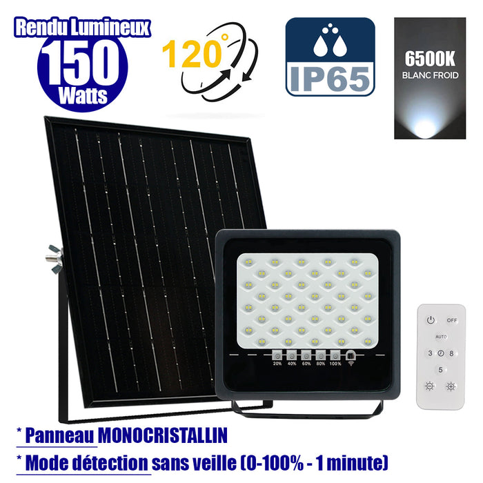 Projecteur LED solaire - Série SECURITY ULTRA - 150 Watts - 900 Lumens - Angle 120° - IP65 - Lampe 21 x 20 x 5 cm - Panneau solaire MONOCRISTALLIN 23 x 21 x 2 cm - Télécommande - 6500k - Mode de détection sans veille (0-100% - 1 minute)