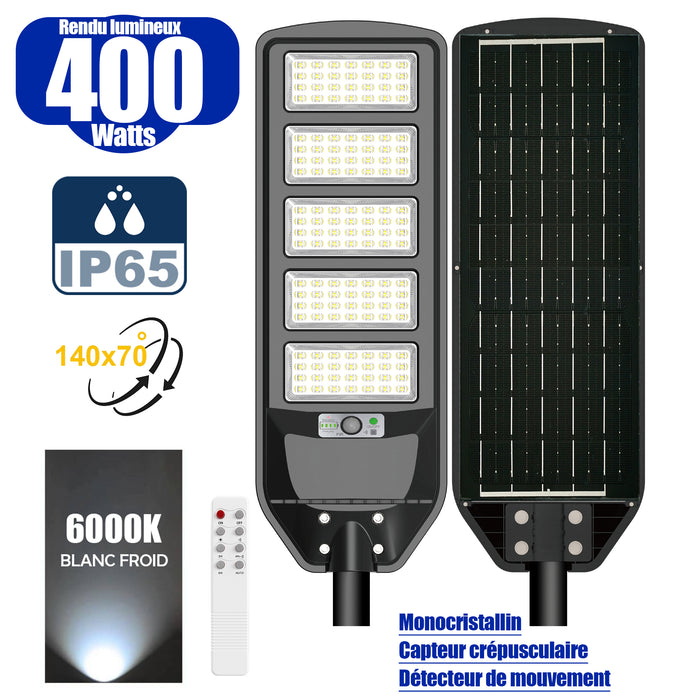Solaire - Luminaire LED pour Candélabre / Lampe de rue et parking - Série VIEW V2 - 400 Watts - 2700 Lumens - Angle 140*70° - IP65 - Lampe 72 x 25 x 5 cm - Panneau MONOCRISTALLIN - 61 x 23 cm - Détecteur de mouvement - 6000k - Tube d'insertion 45mm